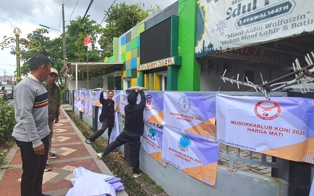 Selain orasi, mereka juga menempelkan nama Cabor masing-masing memenuhi pagar halaman KONI Sidoarjo di Jl. Pahlawan Sidoarjo, dengan tulisan ‘Musorkablub KONI 2026 Harga Mati’ pada (8/4/2026) sore usai menghadiri undangan Konsolidasi Cabor KONI Kabupaten Sidoarjo 2026 di Gedung Youth Disporapar Sidoarjo.