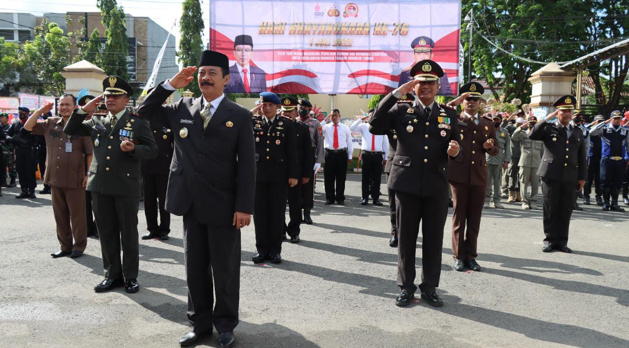 Kapolres Pamekasan AKBP Rogib Triyanto bersama Forkopimda, PJU Polres Pamekasan, Kapolsek jajaran Polres Pamekasan dan perwakilan personel Polres Pamekasan, Polsek jajaran Polres Pamekasan, serta Brimob mengikuti upacara Hari Bhayangkara 1 Juli 2022 lewat live streaming di lapangan apel Mapolres Pamekasan.