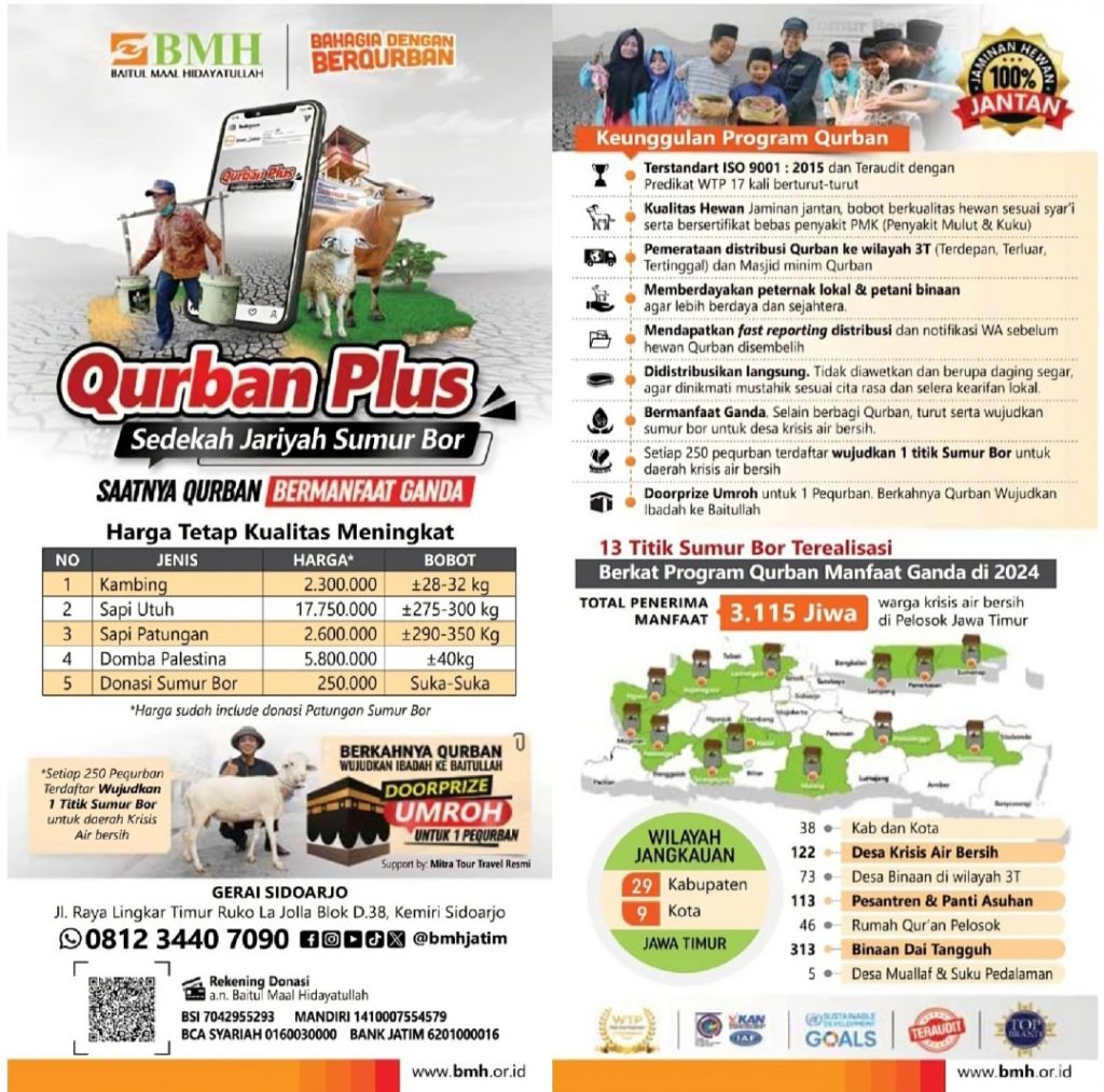 Untuk tahun 2024 lalu, berkat program manfaat ganda di BMH Jatim total penerima manfaat ada 3.115 jiwa di pelosok Jatim. Wilayah jangkauan 29 kabupaten, 9 kota, 122 desa krisis air bersih, 73 desa binaan wilayah 3T, 113 pesantren dan panti asuhan, 46 rumah quran pelosok, 313 binaan dai tangguh dan 5 desa muallaf dan suku pedalalam. Pemerintah saat ini sudah menetapkan Hari Raya Idul Qurban pada Jumat, 6 Juni 2025. (RJ/RED)