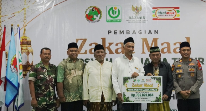 GRESIK (RadarJatim.id) — Koperasi Syariah Mitra Usaha Ideal (Kopsyah MUI) Jawa Timur membagikan zakat maal tahun 1446 H/2025 M senilai Rp 792 juta kepada 4.082 penerima zakat (mustahik). Pembagian zakat maal itu berlangsung di Graha Kopsyah MUI, Jl. Raya Pahlawan, Asempapak, Ngawen, Kecamatan Sidayu, Kabupaten Gresik, Jawa Timur, Kamis (20/3/2025).