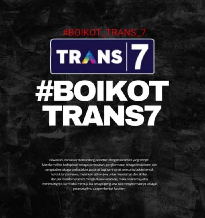 KEDIRI (RadarJatim.id) — Secara mendadak, muncul gelombang protes di media sosial (medsos) dengan hastag #boikottrans7 hingga menduduki trending nomor 4 dengan 4,500 lebih tayangan. Gelombang protes ini muncul dari berbagai macam kalangan, utamanya para santri dan kiai.