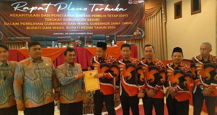 KEDIRI (RadarJatim.id) — Komisi Pemilihan Umum (KPU) Kabupaten Kediri, Jawa Timur menggelar rapat pleno terbuka untuk rekapitulasi dan penetapan Daftar Pemilih Tetap (DPT) untuk Pemilihan Gubernur dan Wakil Gubernur Jawa Timur serta Bupati dan Wakil Bupati Kediri Tahun 2024.