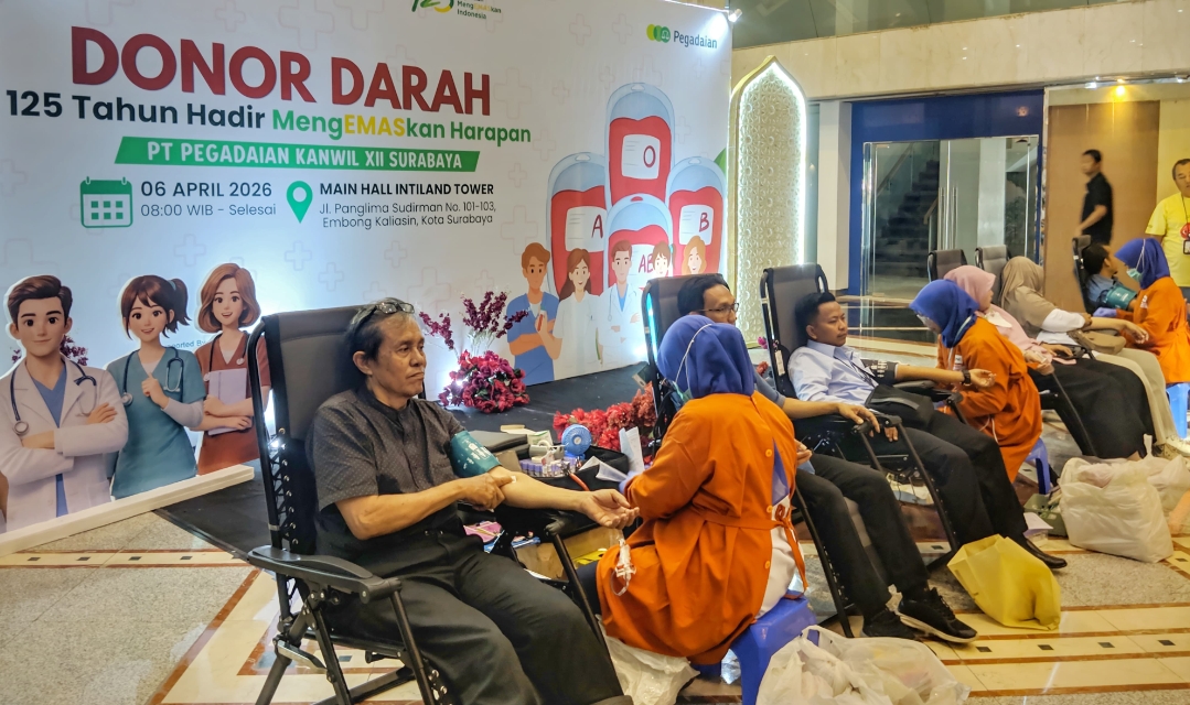 SURABAYA (Radarjatim.id) – Dalam rangka memperingati Hari Ulang Tahun (HUT) ke-125, PT Pegadaian Kantor Wilayah XII Surabaya menggelar kegiatan donor darah yang dilaksanakan di Main Hall Intiland Tower, Jalan Panglima Sudirman No. 101-103, Embong Kaliasin, Surabaya, Senin (06/04/2026).