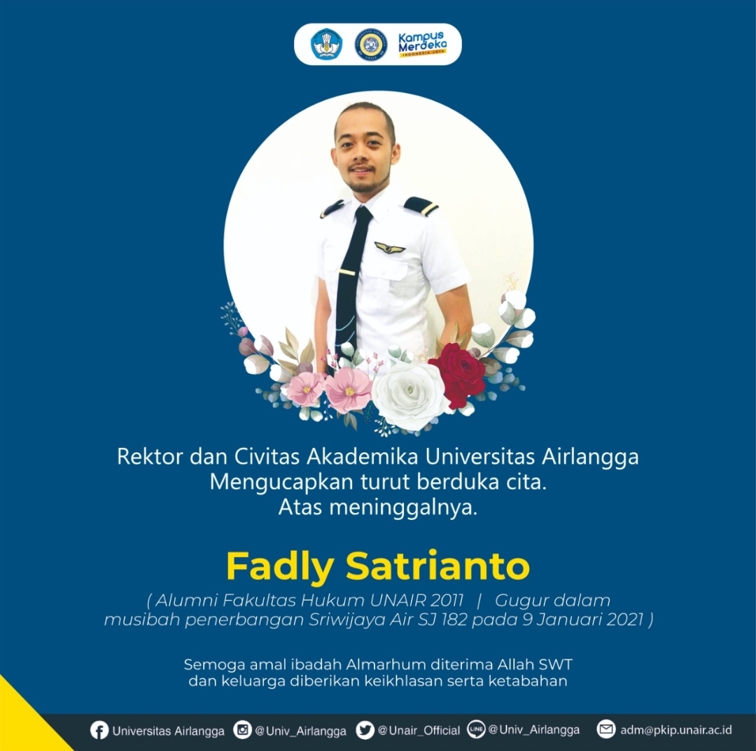 “Rektor dan civitas akademika Universitas Airlangga menyampaikan berbela sungkawa sedalam-dalamnya atas gugurnya saudara kita Fadly Satrianto SH,” Nasih lewat pesan tertulis, Minggu (10/1/2021).