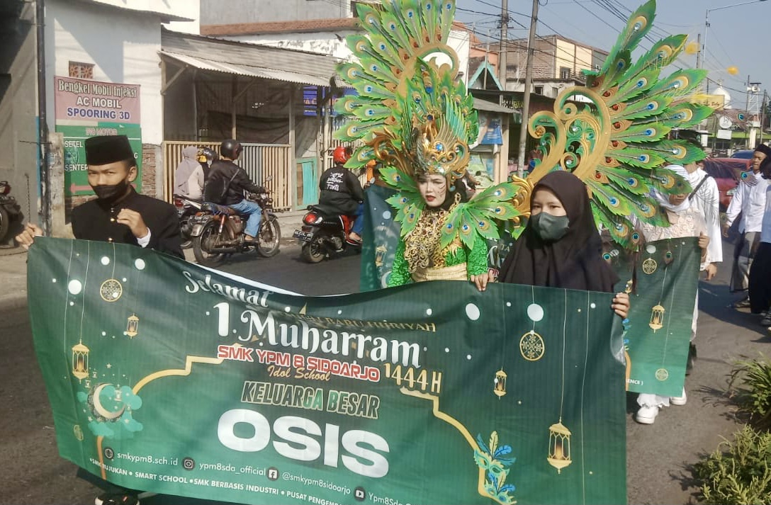 SIDOARJO (Radarjatim.id) Sebanyak 1.650 siswa SMK YPM 8 Sarirogo Sidoarjo turun jalan, gelar pawai muharam menyambut datangnya Tahun Baru Islam, 1 Muharam 1444 Hijriyah. Mereka berjalan sekitar sekolahan sepanjang 3 km dengan berbagaimacam maskot dan atribut keislamannya, sambil mengumandangkan sholawat nabi dan kalimat-kalimat toyibah.