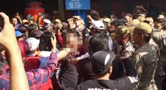 Terjadi aksi saling dorong antara petugas gabungan dengan pedagang pancakan sisi timur Pasar Larangan yang tidak mau ditertibkan.