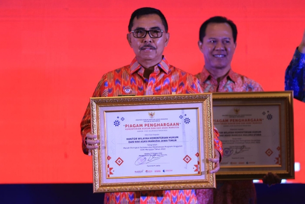 Kanwil Kemenkumham Jatim menyabet tiga penghargaan. Pertama Terbaik I dalam kategori Pelaksanaan Program Unggulan DJKI Mengajar Tahun 2022.