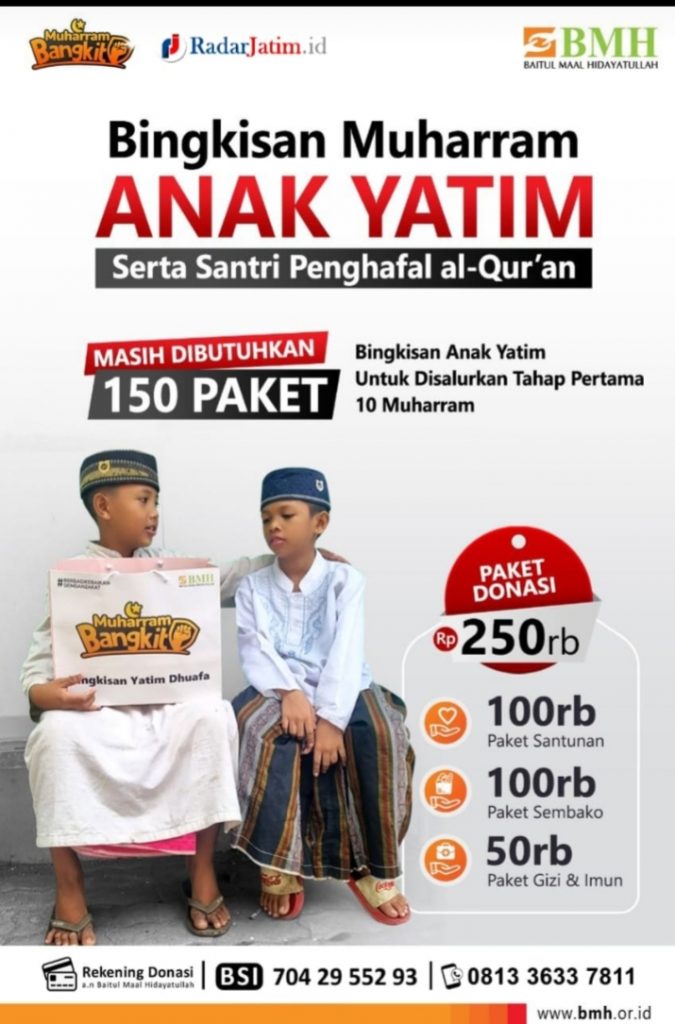 Khusus di bulan muharram, Laznas BMH mengajak donatur serta masyarakat lebih perduli terhadap anak yatim dan dhuafa. Sebagai Upaya mensyiarkan sekaligus Edukasi kepada Masyarakat Dermawan untuk lebih meyanyangi anak yatim dan dhuafa. program ini menyasar anak anak yatim, dhuafa , guru ngaji Pelosok dan Keluarga pra sejahtera.