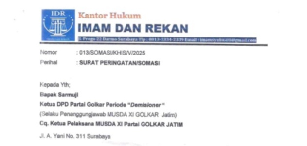 Namun, somasi yang dilayangkan oleh kuasa hukum Heru Susanto dan M. Ruslan dinilai tidak sah oleh Warih Andono, Ketua Depidar SOKSI Jawa Timur, Jum’at (23/05/2025).