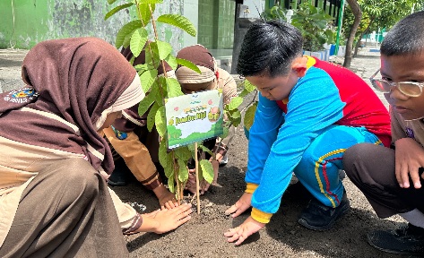 Setelah presentasi kegiatan dilanjutkan dengan menanam pohon Bersama-sama. “Kami membawa bibit pohon buah diantaranya pohon mangga, pohon jambu, pohon belimbing dan pohon jeruk nipis” kata ustazah Sri Juhariyah, S.Pd. selaku koordinator acara dari SD Al Muslim.