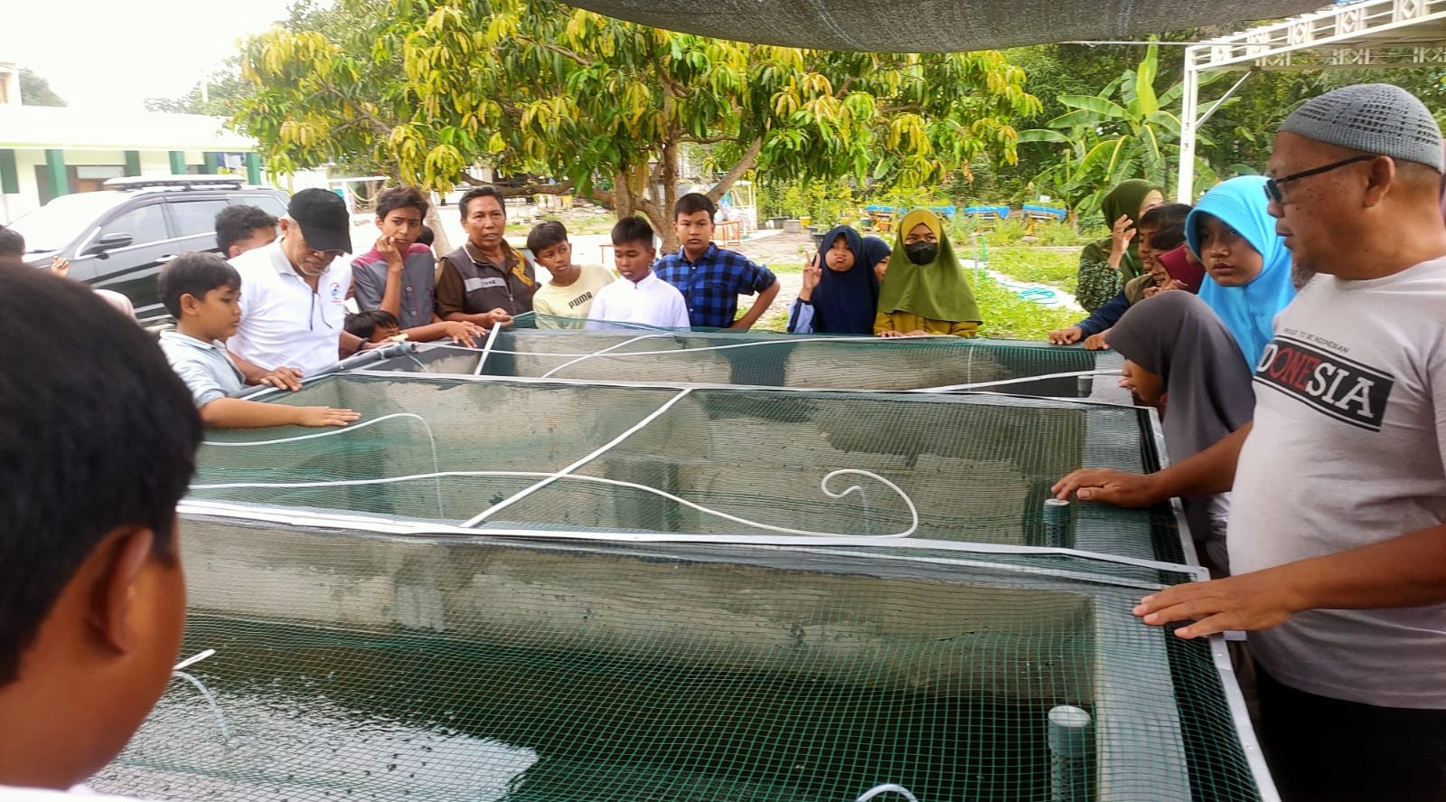 GRESIK (RadarJatim.id) — Para siswa SD Alam Muhammadiyah Kedanyang (SD Almadany) Kebomas, Gresik, mulai menerima pembelajaran budi daya ikan di kolam, Senin (3/11/2025). Kegiatan ini masuk dalam intrakurikuler Cilukba (cintai lingkungan bersama SD Almadany) yang berlokasi di Perum GKGA Kedanyang ini.