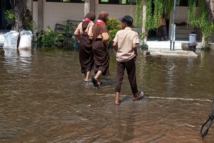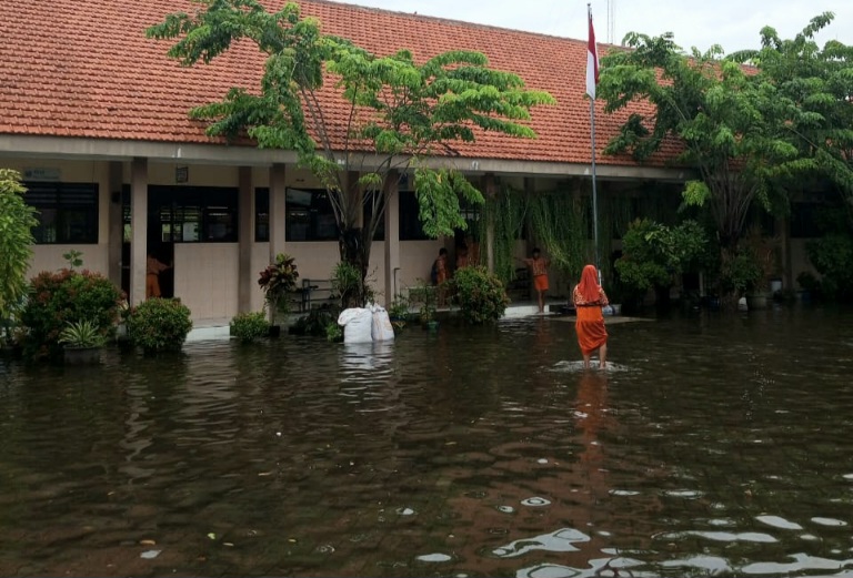 Namun jalan akses masuk ke sekolah juga banjir cukup dalam, hingga 25 centimeter, bahkan ada yang lebih. Tapi dengan penuh semangat para siswa dan gurunya terus berupaya untuk tetap belajar di sekolah.