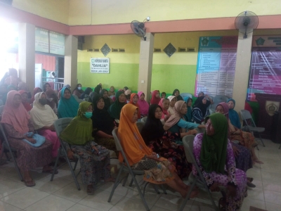 Para KPM sedang menunggu giliran untuk mendapatkan 10 kilogram beras BPNT dari Kemensos RI di Balai Desa Dukuhsari.