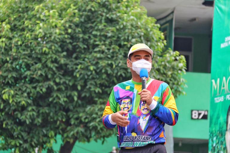 Cawawali nomer urut 2, Mujiaman Sukirno saat acara senam di Adityawarman, Sawunggaling, Wonokromo, Kota Surabaya