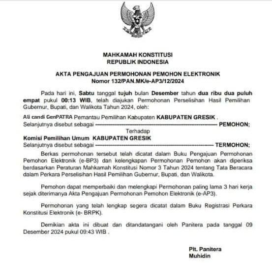 “Pada hari ini, Sabtu tanggal tujuh bulan Desember tahun dua ribu dua puluh empat pukul 00.13 WIB, telah diajukan Permohonan Perselisihan Hasil Pemilihan Gubernur, Bupati, dan Walikota Tahun 2024, oleh Ali Candi GenPATRA Pemantau Pemilihan KABUPATEN GRESIK. Selanjutnya disebut PEMOHON; terhadap Komisi Pemilihan Umum KABUPATEN GRESIK. Selanjutnya disebut sebagai TERMOHON,” tulis Akta Pengajuan Permohonan Pemohon Elektronik, Nomor 132/PAN.MK/e-AP3/12/2024.