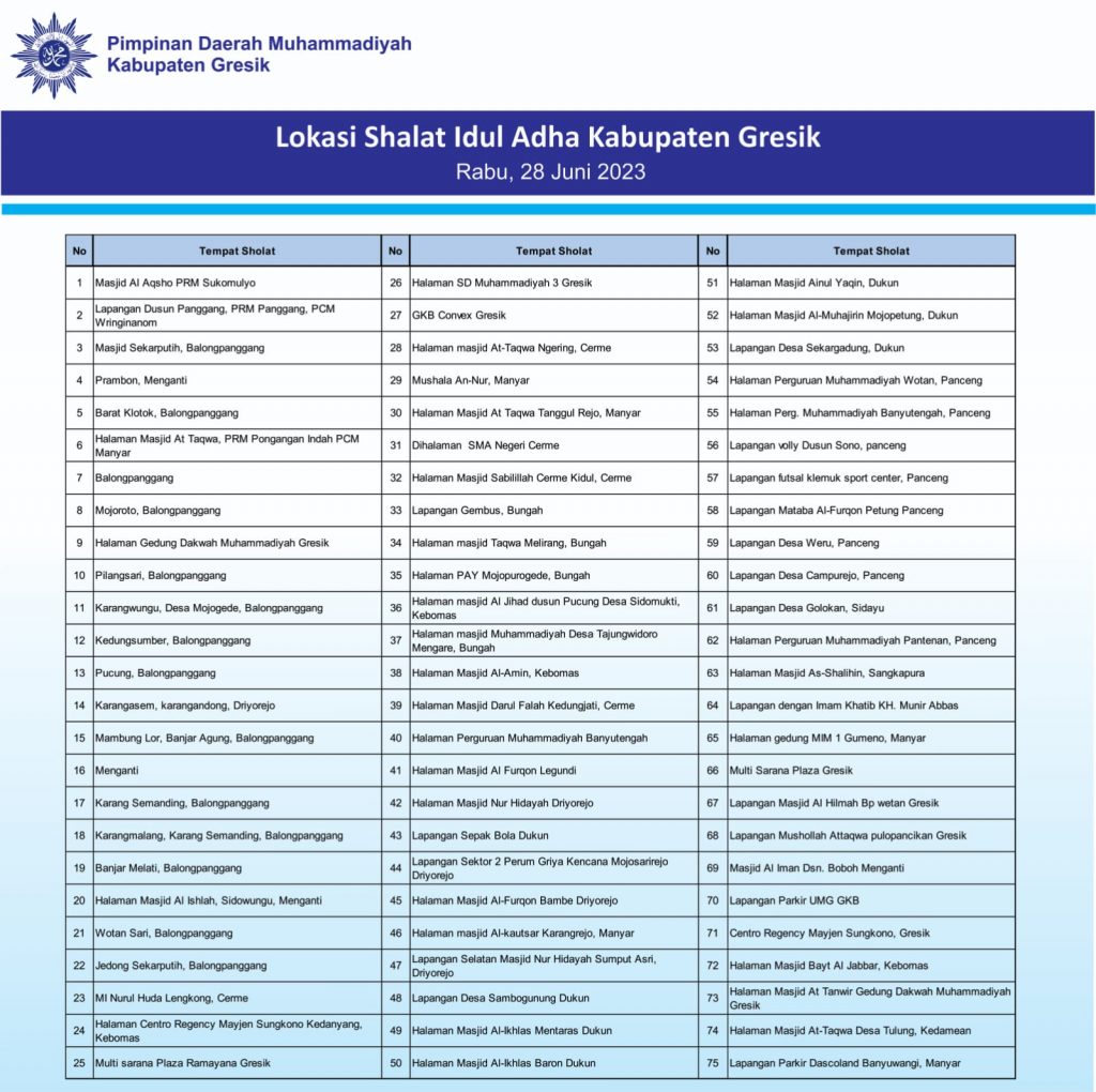 Berikut sebagian titik-titik lokasi pelaksanaan sholat Idul Adha yang digelar warga Muhammadiyah di wilayah Kabupaten Gresik, Rabu, 28 Juni 2023.