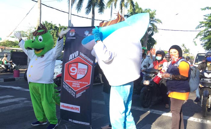 SURABAYA (radarjatim.id) Dua badut maskot Pilwali Surabaya 2020, SiRo dan SiBoy bersama Panitia Pemilihan Kecamatan (PPK) Kecamatan Wonocolo turun ke jalan untuk menyapa pengguna jalan di kawasan Jalan Margorejo, Jumat (11/9/2020). Mereka menyampaikan sosialisasi pemilu kepada para pengguna jalan agar turut meramaikan pesta demokrasi warga Kota Pahlawan.
