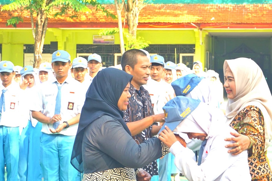 Secara simbolis melepas atribut sekolah yaitu dasi dan topi juga dilakukan oleh Wiwik Tri Ernawati terhadap dua perwakilan siswa yaitu Salsabila Shofy dan M. Daffa Fadhurahman.