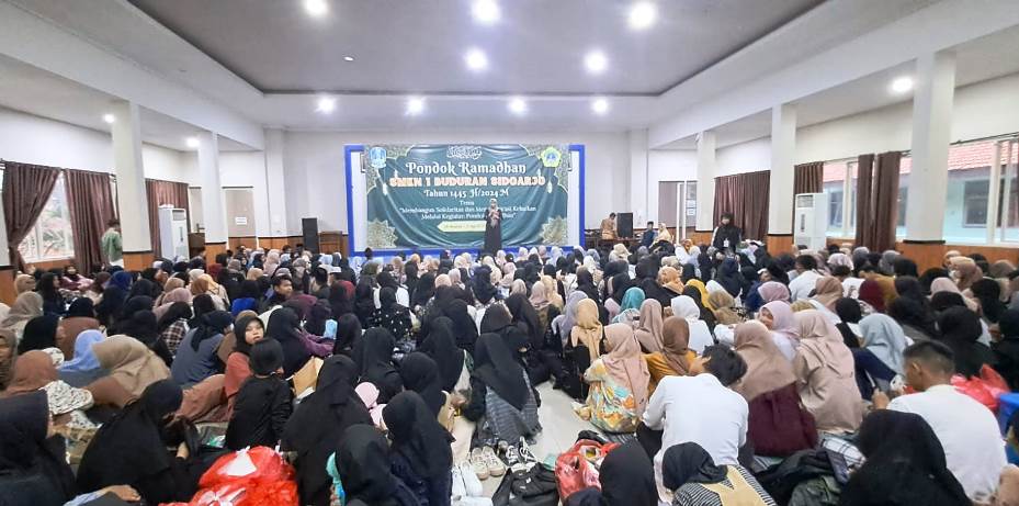 SIDOARJO (RadarJatim.id) — Jelang berbuka puasa bersama di SMK Negeri 1 Buduran telah dilakukan pembukaan kegiatan Pondok Ramadhan 1445 H bagi siswa-siswinya. Mereka sangat antusias mengikuti jalannya pembukaan,  telah memadati seluruh ruangan sambil mendengarkan lantunan musik Al Banjari siswa SMK Negeri 1 Buduran.