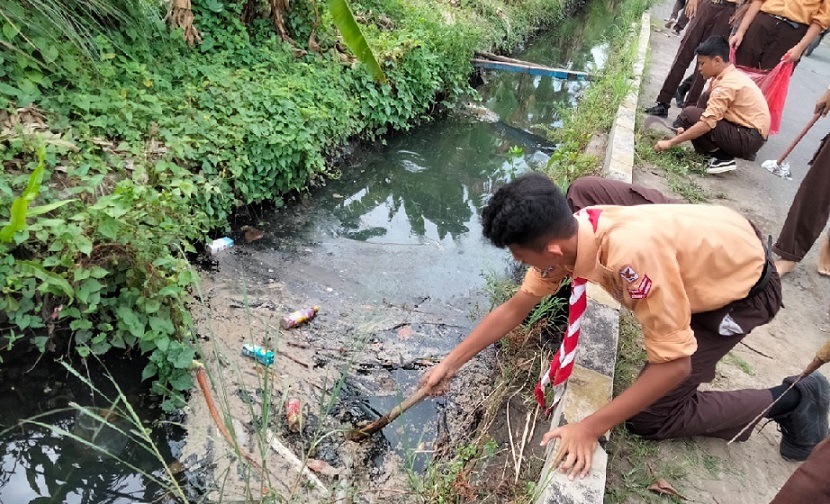 Mereka kami turunkan semuanya, mulai siswa kelas VII, VIII dan IX, bahkan para guru-gurunya juga turun ikut membersihkan sampah bersama para siswa. “Siswa yang laki-laki sampai turun sungai depan sekolah, karena aliran ainya tidak lancar. Padahal sungai tersebut merupakan aliran untuk persawahan warga. Setelah berhasil dibersihkan aliran airnya langsung lancar. Dan mendapatkan apresiasi RT setempat,” katanya.