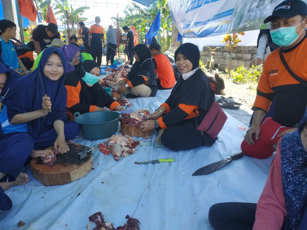 Kepala SMAMDA berbaur bekerja bersama-sama memotong daging kurban yang akan dibagikan ke warga sekitar