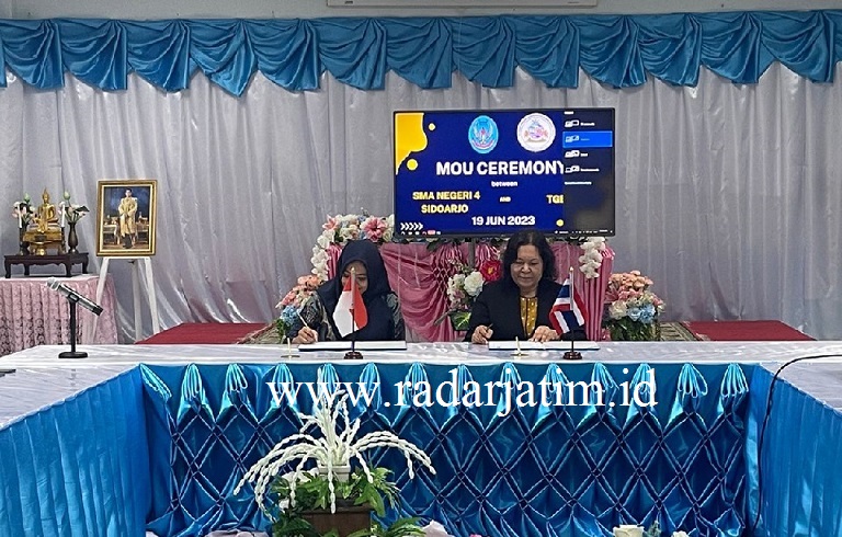 SIDOARJO (RadarJatim.id) – SMA Negeri 4 Sidoarjo terus meningkatkan kualitasnya, yakni dengan mengembangkan program-program pendidikan hingga pertukaran pelajar dan guru. Kali ini pihaknya telah bekerja sama dengan Thai Global Business Administ Tion Technological College (TGBC) Samut Prakan, Thailand.