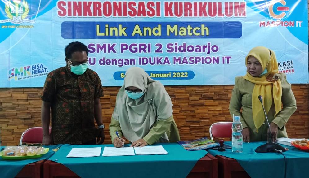Kini SMK PGRI 2 Sidoarjo melakukan kerjasama dengan Iduka Maspion IT, sekaligus dilakukan teken MoU (Memoradum of Understanding) kedua belah pihak. Proses penandatanganan dari pihak sekolah oleh Kepala SMK PGRI 2 Sidoarjo Ida Rohmatiyah, S.Ag dan dari pihak Maspion IT Icon IT Indonesia oleh CEO Amigroup Maspion IT, Ir. Okky Tri Hutomo, M. IT, pada Senin (10/1/2022) tadi siang, di Aula SMK PGRI 2 Sidoarjo.