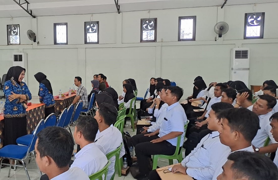 Kepala Disnaker Sidoarjo Ainun Amalia sedang memberi arahan-arahan kepada alumni SMK pencari kerja di SMK Senopati Sedati
