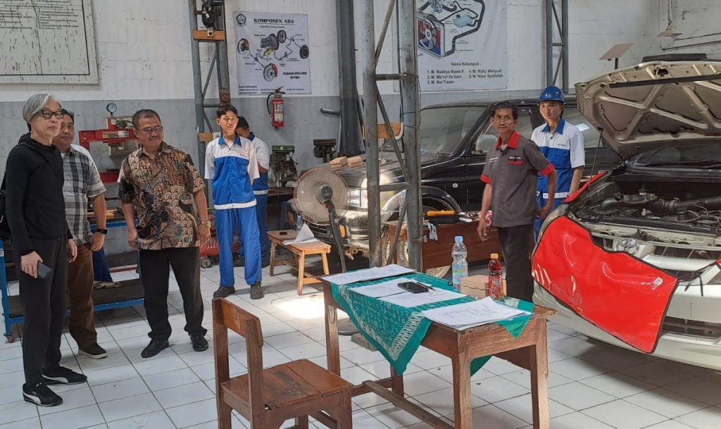 Usai pertemuan, Mr. Mikami Taku dan tim LPK Kizuma keliling melihat ruang praktik, Lab Teknik Sepada Motor dan Workshop Mobil, dipandu langsung oleh Kepala SMK Senopati Sedati, Fathoni.(mad)
