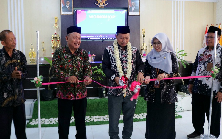 Kepala Dinas Dikdud Sidoarjo menggunting pita didampingi Kepala SMPN 1 Jabon simbolis launching Pentigraf dan Bukuk Antologi