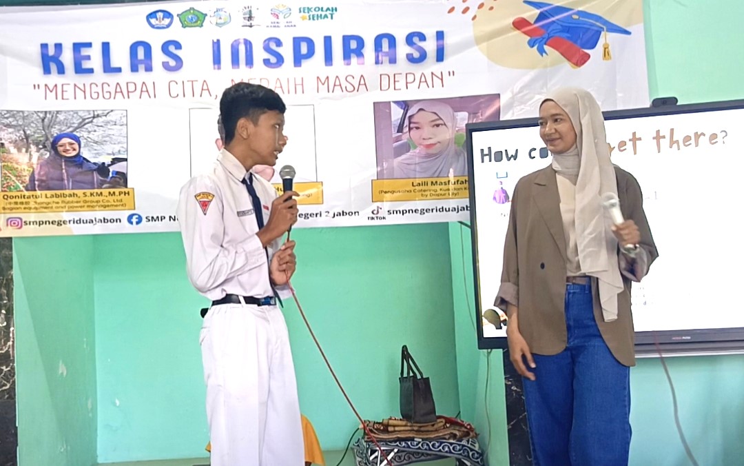 Adapun pemateri yang dihadirkan, juga lulusan dari SMP Negeri 2 Jabon, adalah Qonitatul Labibah, S.KM., M.PH yang merupakan Equipment and Power management Officer ZC Rubber Group Co.,Ltd. Ia juga lulusan S-2 di salah satu universitas di China lewat beasiswa.