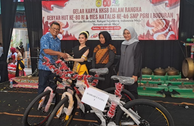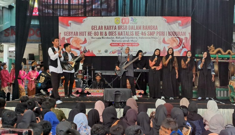 SIDOARJO (RadarJatim.id) — Peringatan HUT RI ke 80 yang dilakukan oleh SMP PGRI 1 Buduran, sekaligus dilaksanakan Dies Natalis ke 46 SMP PGRI 1 Buduran, menampilan seni budaya karya siswa kelas KKSB (Kelas Khusus Seni Budaya), pada (30/8/2025) pagi di halaman sekolah.