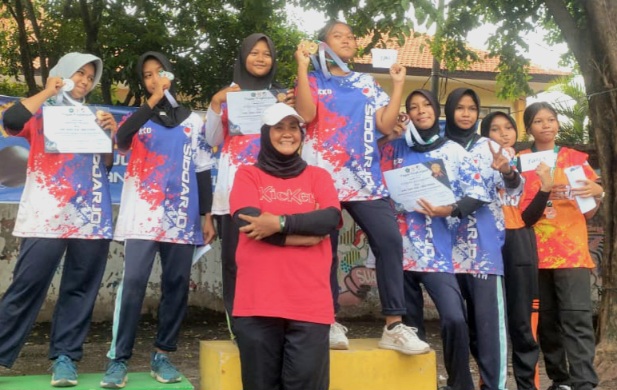 Pelatih Umi Salmami bersama para atlet-atletnya usai meraih juara umum Cabor Pentaque Kejurkab Sidoarjo 2025