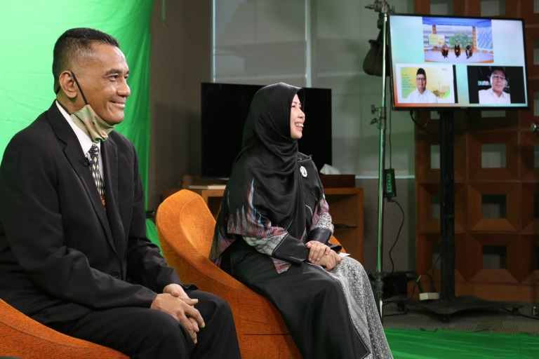 Pemimpin Divisi Haji dan Umroh BNI Syariah, Endang Rosawati (dua dari kiri); Direktur Keuangan & Manajemen Risiko PT PP (Persero) Tbk, Agus Purbianto (layar kanan bawah); dan Direktur Sahid Tour & Travel, Hari Prakoso (paling kiri); Ustadz & Pembimbing Jemaah Haji Sahid Tour & Travel, Ali Nurdin (layar kiri bawah) dalam acara talkshow webinar, di Kantor Pusat BNI Syariah, Selasa (27/10).