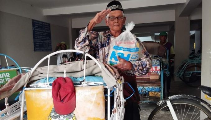 GRESIK (RadarJatim.id) — Kegembiraan tak bisa disembunyikan dari raut mukanya. Saking girangnya menerima bantuan sembako dan uang tunai, Mbah Supi’i, sang penarik becak yang seluruh rambutnya telah memutih itu spontan memberikan hormat kepada Sahabat Sejuk Nurul Hayat (NH).