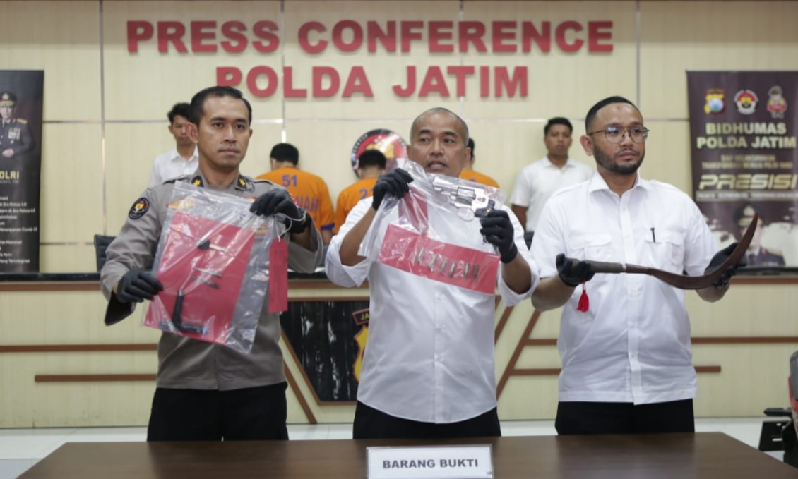 Subdit Jatanras Polda Jatim, menggelar ungkap kasus di Gedung Humas Mapolda Jatim. Barang bukti yang disita petugas berupa, 1 senjata Soft Gun serta amunisi, 1 set Kunci T, 3 motor (Honda Scoppy dan Vario), Celurit dan 1 unit Pick Up Grand Max.