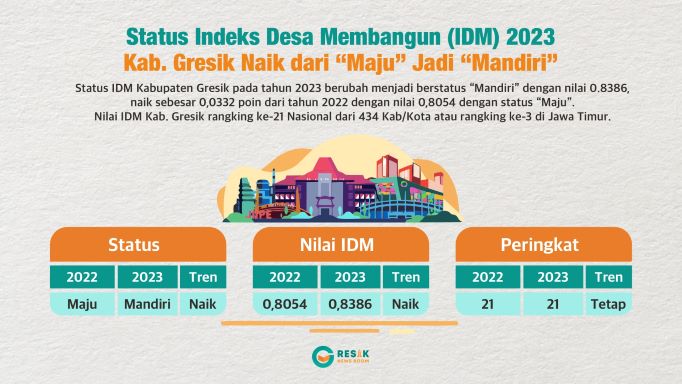 Mengutip rilis data akun Instagram @pemkabgresik yang dikelola Dinas Kominfo Gresik, sudah tidak ada lagi desa dengan status “berkembang” di Kabupaten Gresik pada tahun 2023 ini. Sebanyak 21 desa yang tahun 2022 berstatus “Berkembang” pada tahun 2023 ini telah naik status menjadi “Mandiri”. Sehingga di Kabupaten Gresik jumlah Desa Mandiri sebanyak 222 Desa dan Desa Maju sebanyak 108 Desa.