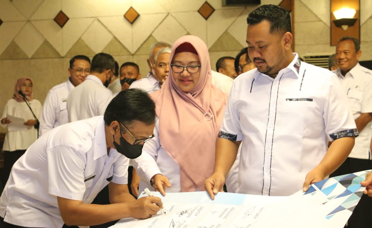 Selepas memberikan sambutan dan arahan, Gus Yani dan Bu Min bersama-sama dengan Sekretaris Daerah Kabupaten Gresik Achmad Washil Miftahul Rachman bersama kepala OPD di lingkungan Pemkab Gresik serentak membubuhkan tanda tangan sebagai simbol komitmen dalam penanggulangan stunting. Hal yang sama juga dilakukan oleh berbagai perwakilan unsur pendidikan, organisasi masyarakat, serta jajaran camat yang hadir. (sto)