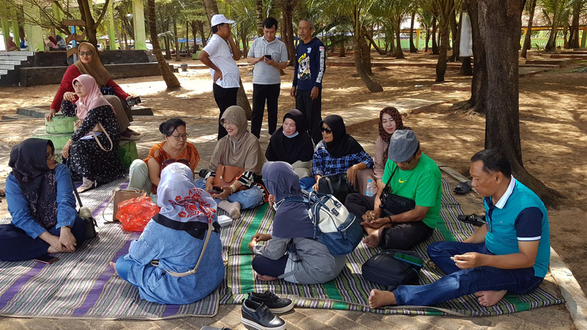 Selain duduk bercengkerama mereka berfoto-foto selfi. Bergaya berboncengan naik motor ATV, tidak apa-apa meskipun sudah pada tua. Sebagian turun mendekat air laut, bergembira momong cucu. “Cucu saya kerasan. Dia tidak mau mentas. Maunya mandi terus. Gak mau pulang, Uti,” kata Dra. Ngesti Rahayu sambil tertawa.