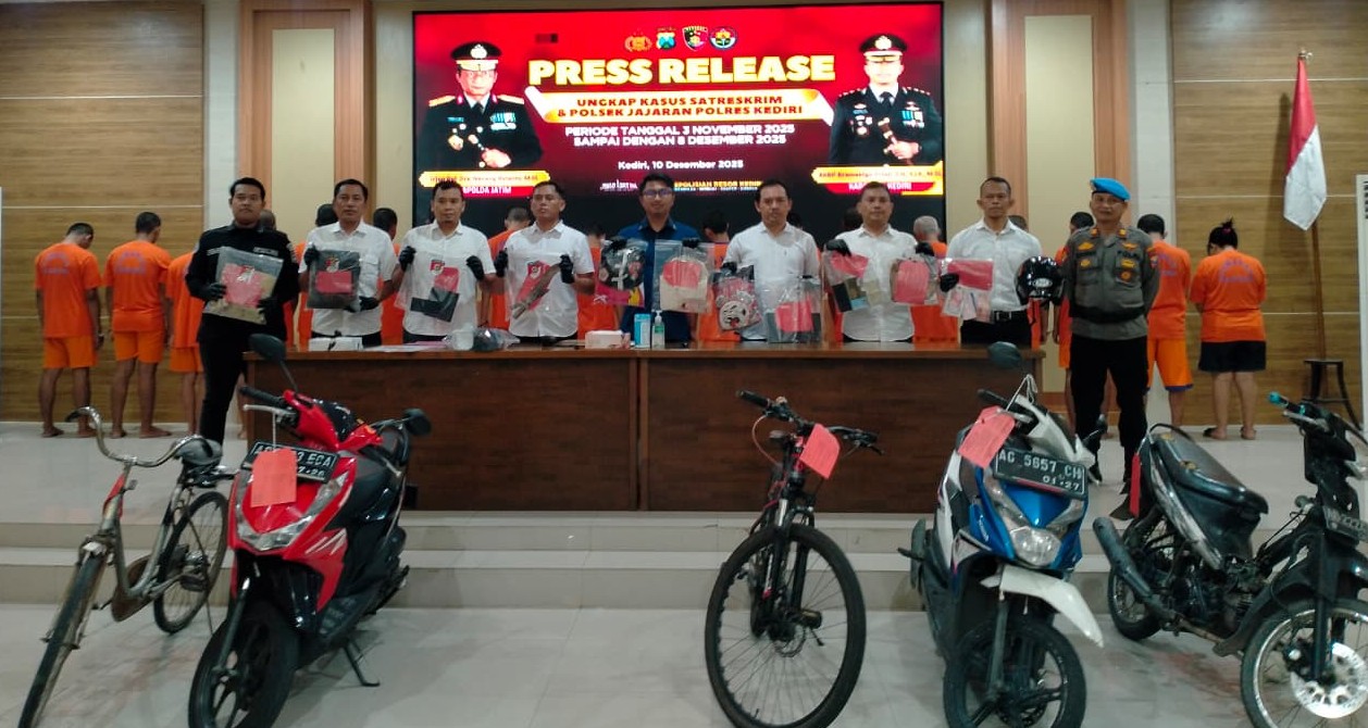 KEDIRI (RadarJatim.id) – Polres Kediri mencatat meningkatnya kasus kriminal kecil hingga menengah sepanjang akhir tahun 2025 yang terhitung sejak 3 November hingga 8 Desember. Mulai dari pencurian barang-barang rumah tangga, perhiasan emas, penipuan berbasis sewa kendaraan, hingga penggelapan handphone dan motor, semuanya menunjukkan pola yang sama: pelaku sebagian besar terdorong kondisi ekonomi dan kebutuhan mendesak.