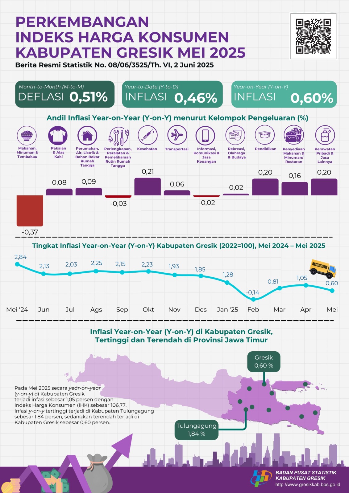 Jika dibandingkan dengan bulan yang sama tahun sebelumnya, inflasi Gresik mengalami penurunan yang cukup tajam. Pada Mei 2024, inflasi y-on-y mencapai 2,84 persen, sementara tahun ini hanya 0,60 persen. Sementara itu, inflasi tahun kalender (year to date/y-to-d) Gresik hingga Mei 2025 tercatat 0,46 persen, juga lebih rendah dari tahun lalu di periode yang sama.