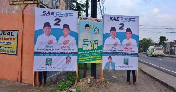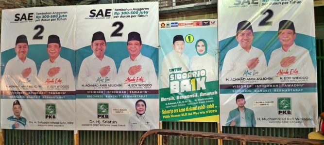 Baliho atau Alat Peraga Kampanye (APK) maupun Bahan Kampanye (BK) milik Sriatun dan Rafi Wibisono yang menyatakan dukungannya ke Paslon SAE tersebar di beberapa titik diwilayah Kabupaten Sidoarjo.