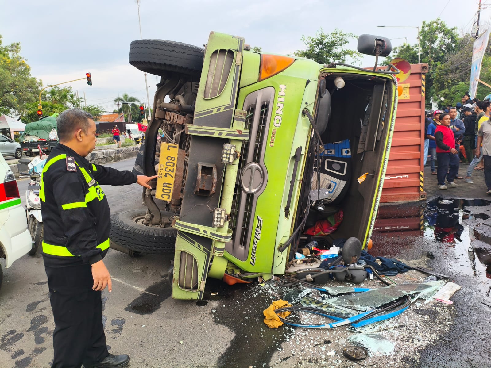 Kecelakaan maut itu terjadi sekitar pukul 15.40. Truk trailer bernomor polisi L 8034 UDC melaju dari arah Surabaya menuju Mojokerto. Baru beberapa meter meninggalkan garis lampu merah, kendaraan besar tersebut tiba-tiba oleng lalu terguling. Boks kontainer bermuatan kertas jatuh ke sisi jalan dan menimpa sepeda motor yang berada di dekat persimpangan.