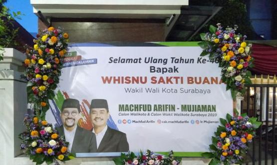 SURABAYA (RadarJatim.id) – Peringatan Hari Santri, Kamis (22/10/2020) sekaligus menjadi hari perayaan ulang tahun Wakil Walikota Surabaya Whisnu Sakti Buana. Di tengah perayaan yang sederhana, WS juga mendapat karangan bunga ucapan milad dari Paslon Machfud Arifin dan Mujiaman.