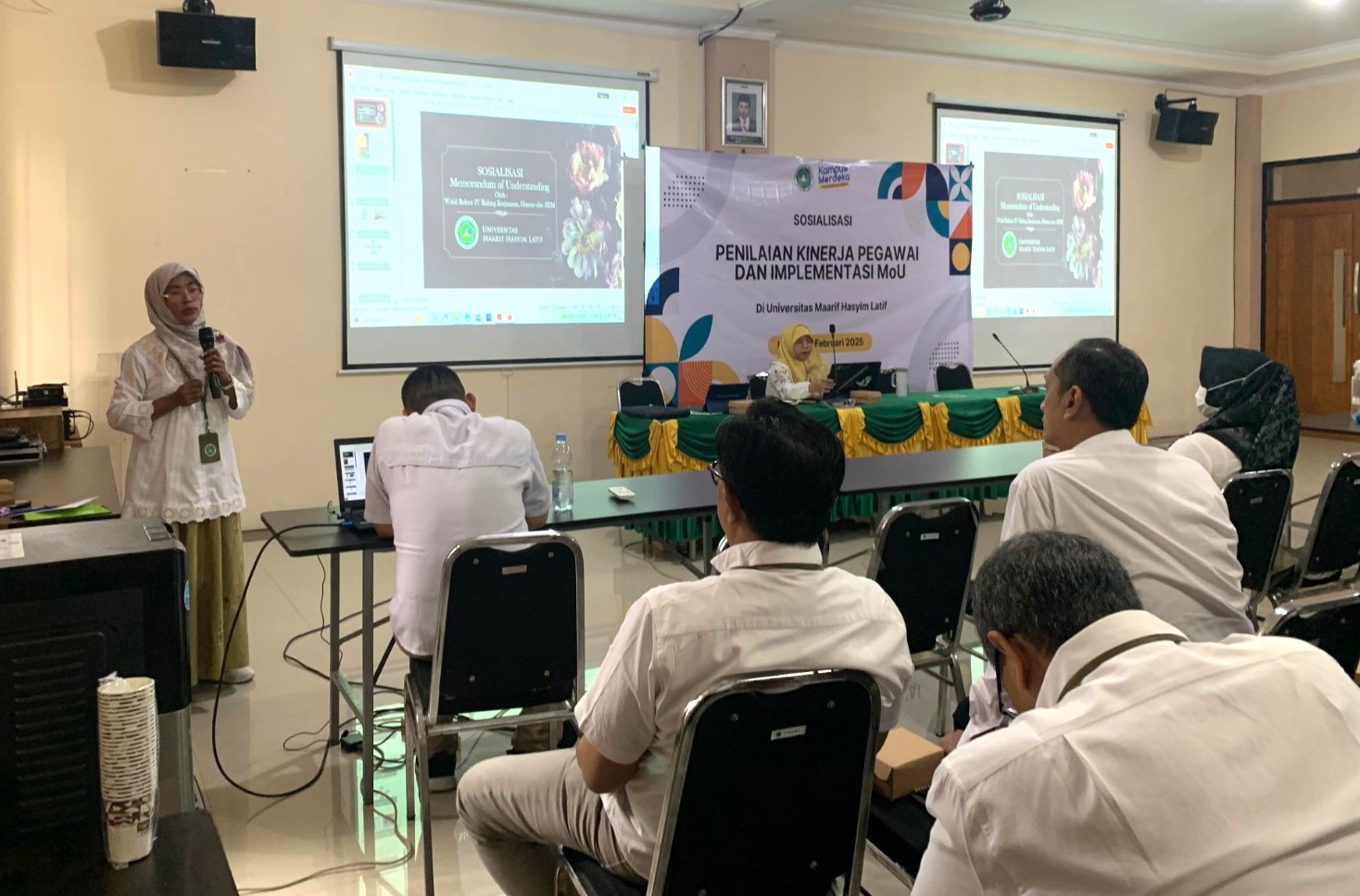 Universitas Maarif Hasyim Latif (UMAHA) Sidoarjo menyelenggarakan Sosialisasi Penilaian Kinerja Pegawai dan Implementasi MoU bagi seluruh Dosen, dan Tenaga Kependidikan (TKP) atau sebanyak 80 orang di lingkungan UMAHA, pada (20/2/2025) pagi di Gedung Rektorat Umaha Sidoarjo.