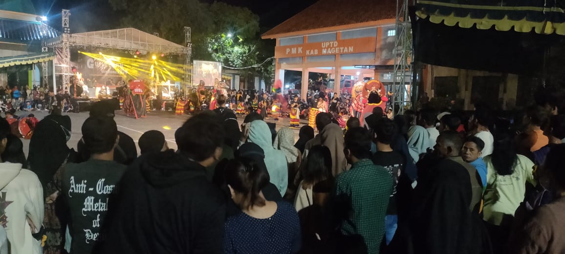 Kegiatan yang dihadiri ratusan warga ini mengambil tema tema  “KANOMAN SONGSONG GUMERAH 2024. Dengan menampilkan berbagai macam pentas seni dan hiburan seni jaranan pada Mabtu(31/12/2023) malam tersebut digelar di pelataran Dinas PUPR Kabupaten Magetan.