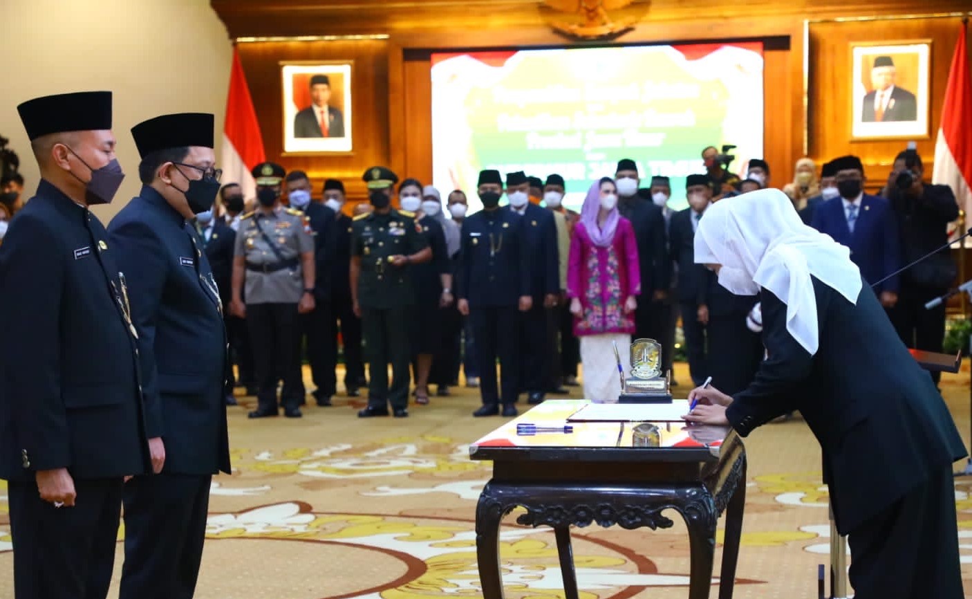 SURABAYA (RadarJatim.id) — Gubernur Jatim Khofifah Indar Parawansa melantik Adhy Karyono sebagai Sekdaprov Jatim. Pengambilan sumpah jabatan dan pelantikan dilaksanakan di Gedung Negara Grahadi, Surabaya, Jumat (15/7/2022).