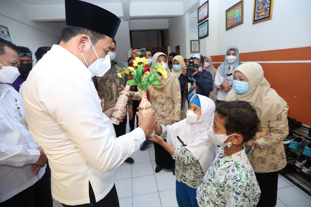 SIDOARJO (Radar Jatim.id) Wakil Bupati Sidoarjo Subandi bersama Kepala Dinas Pendidikan dan Kebudayaan Kabupaten Sidoarjo Tirto Adi serta Camat Waru Rudi Setiawan melakukan sidak ke SD Al-Muslim dan SDN 1 Wadung Asri, untuk melihat secara langsung proses Pembelajaran Tatap Muka (PTM) di sekolah tersebut, pada Selasa (12/1/2022).