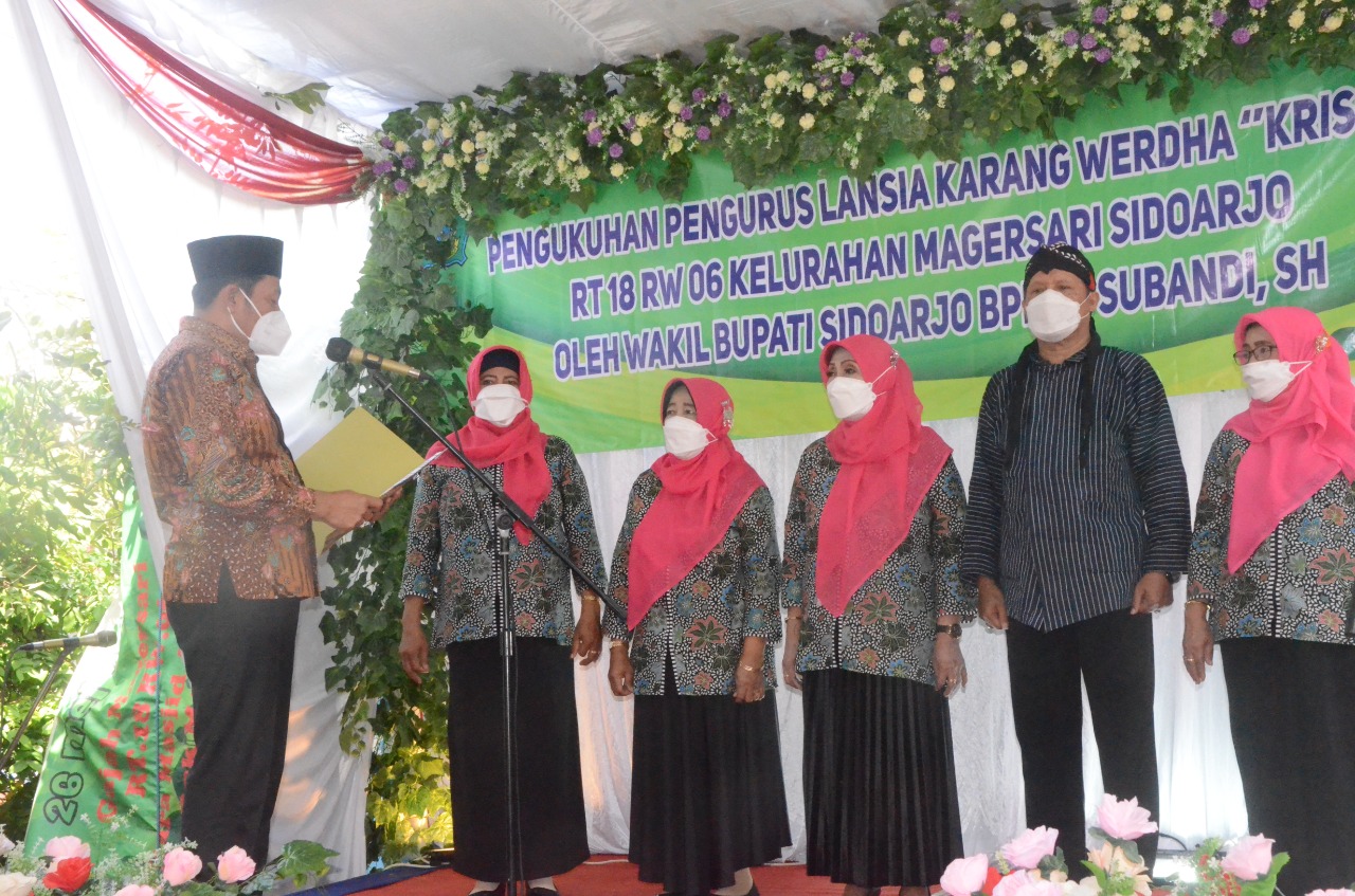 Wakil Bupati Sidoarjo, H. Subandi selaku Ketua Komda Lansia Kabupaten Sidoarjo mensupport para lansia Kabupaten Sidoarjo untuk tetap berkarya, pada saat pengukuhan Pengurus Lanjut Usia Karang Werda “Krisna” Rt 18, RW 6 Desa Magersari pagi tadi (13/3/2022).