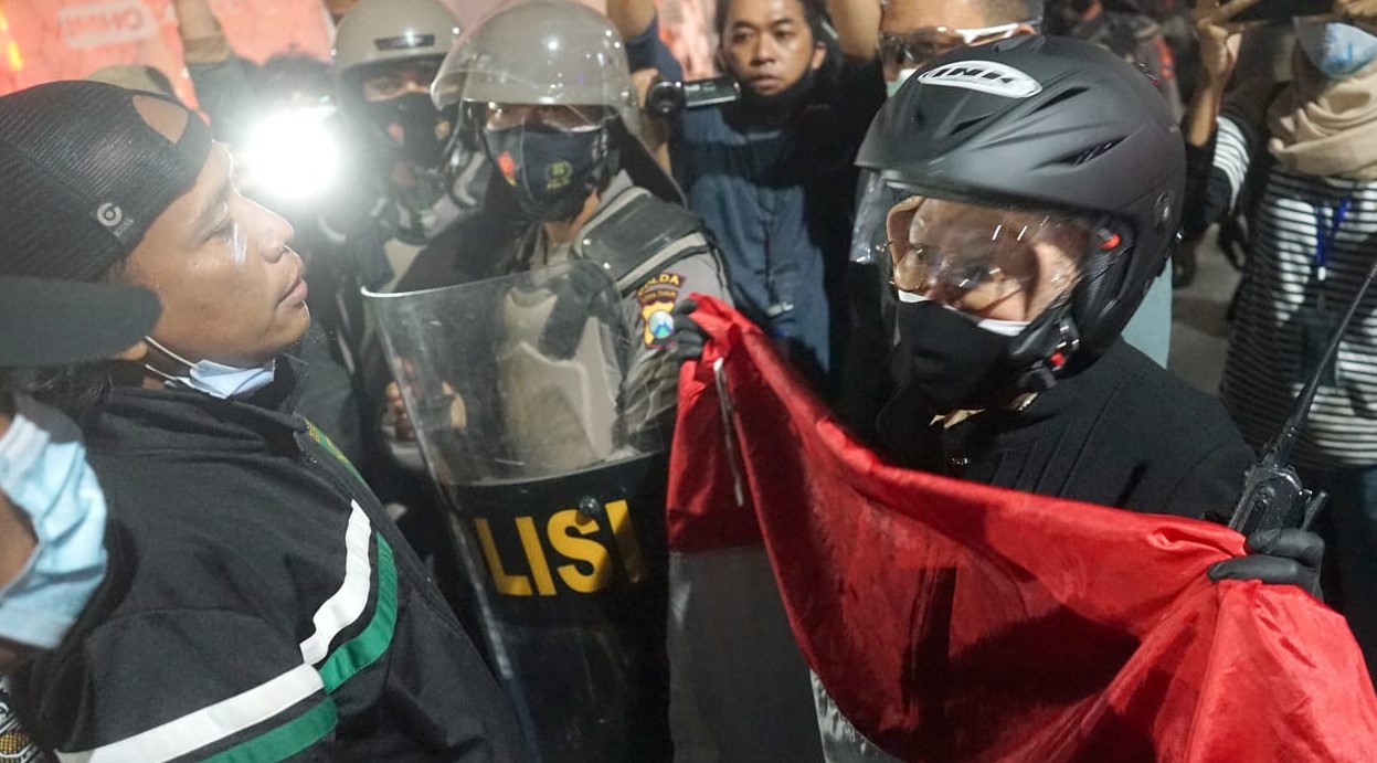 Kondisi porak poranda terjadi di sejumlah ruas jalan di jantung kota Surabaya usai aksi demo menolak UU Cipta Kerja, Kamis (8/10/2020) malam. Setelah massa dibubarkan, tim gabungan SKPD Pemkot Surabaya kerja bakti. Mereka lembur membersihkan sisa dan kerusakan akibat aksi oknum demonstran.